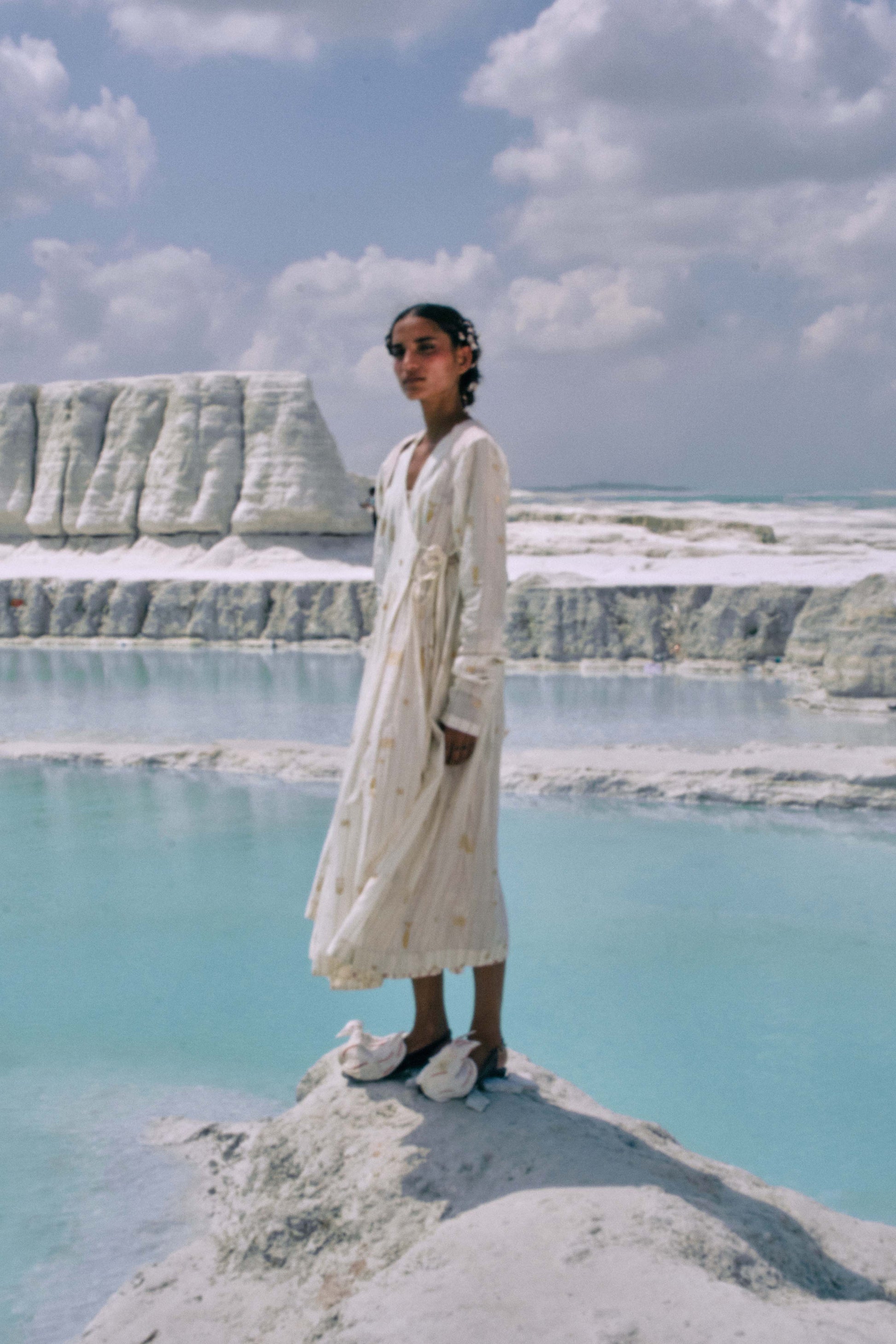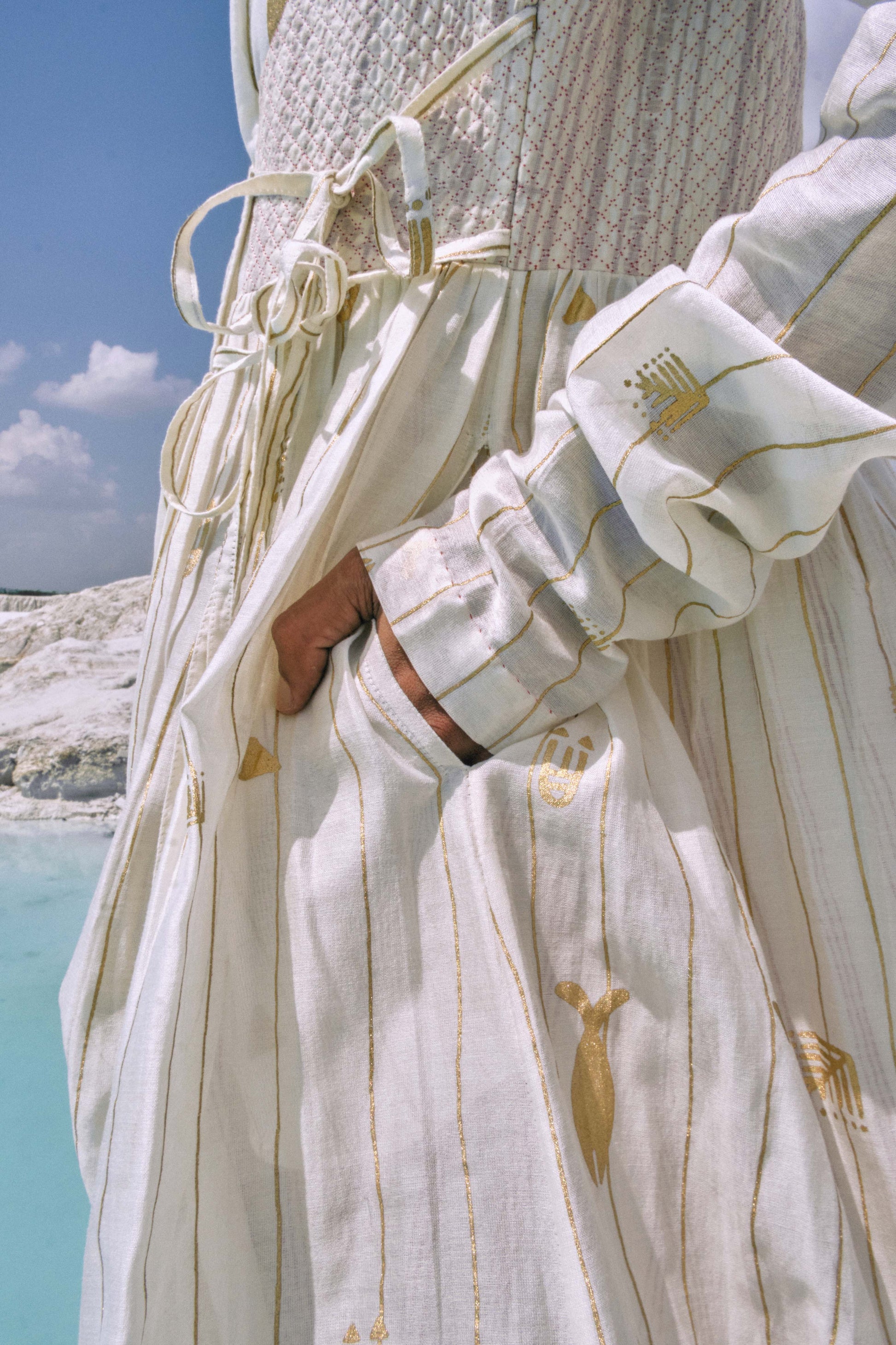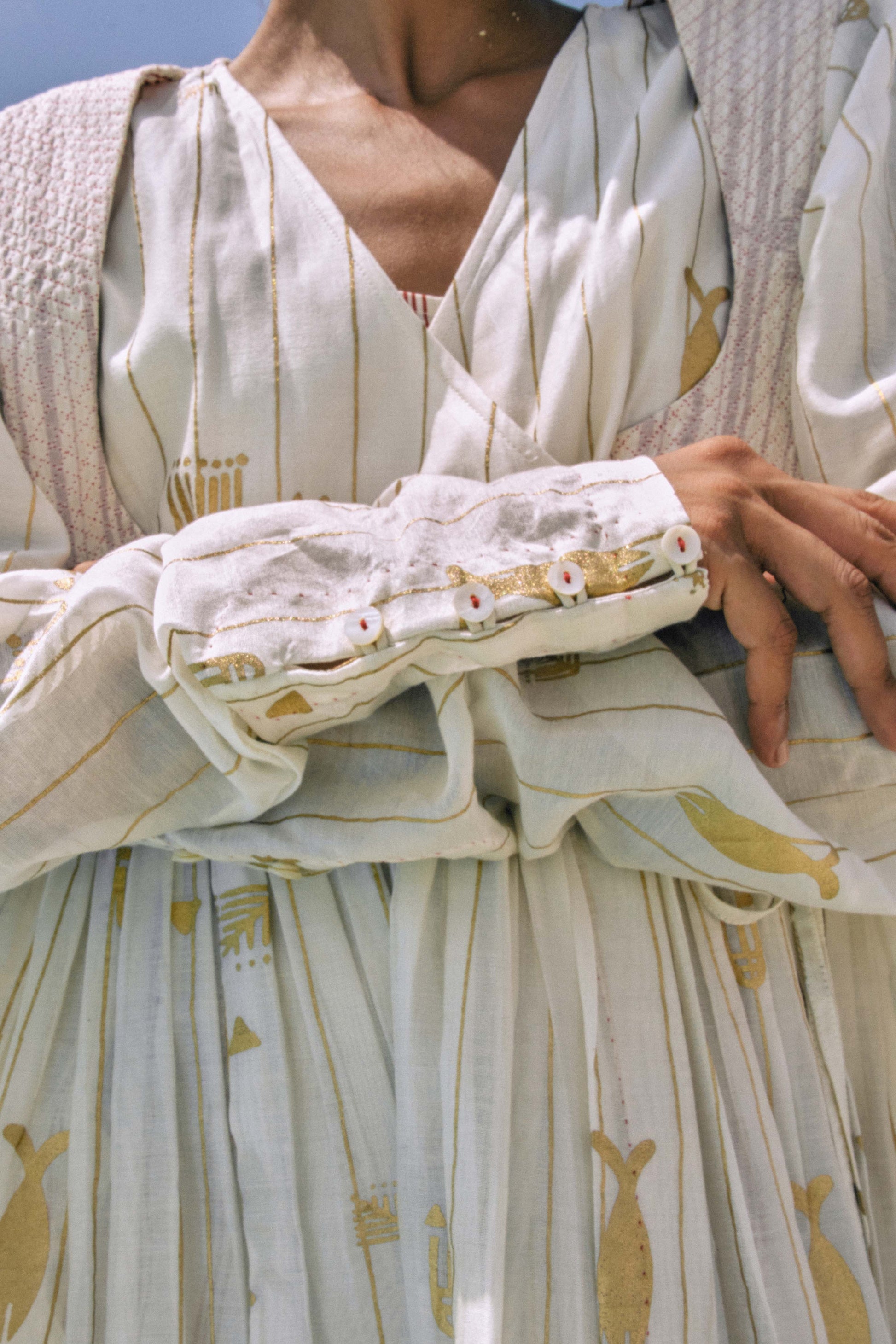 The Elysia Angrakha, in hand-screen-printed cotton silk, is a graceful complement to any bottom. A quilted yoke and overlapping panels are secured with tie-ups finished with handmade beaded tassels, while traditional gathered sleeves with button-loop cuffs add subtle charm. Paired with a cotton slip, it drapes effortlessly, celebrating the ease of balmy days and quiet elegance. Each stitch and tassel has been carefully executed with hours of meticulous artisan labour, rendering the top a wearable work of refined craftsmanship.