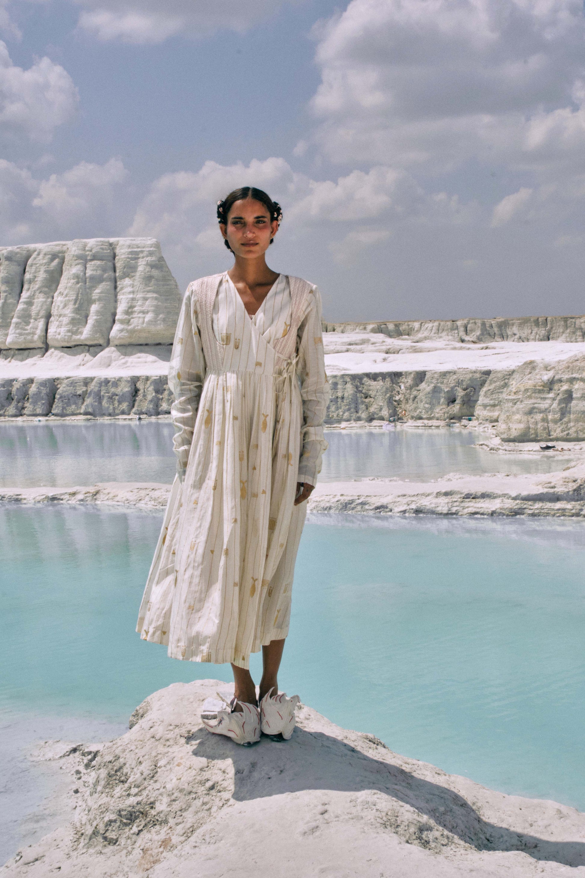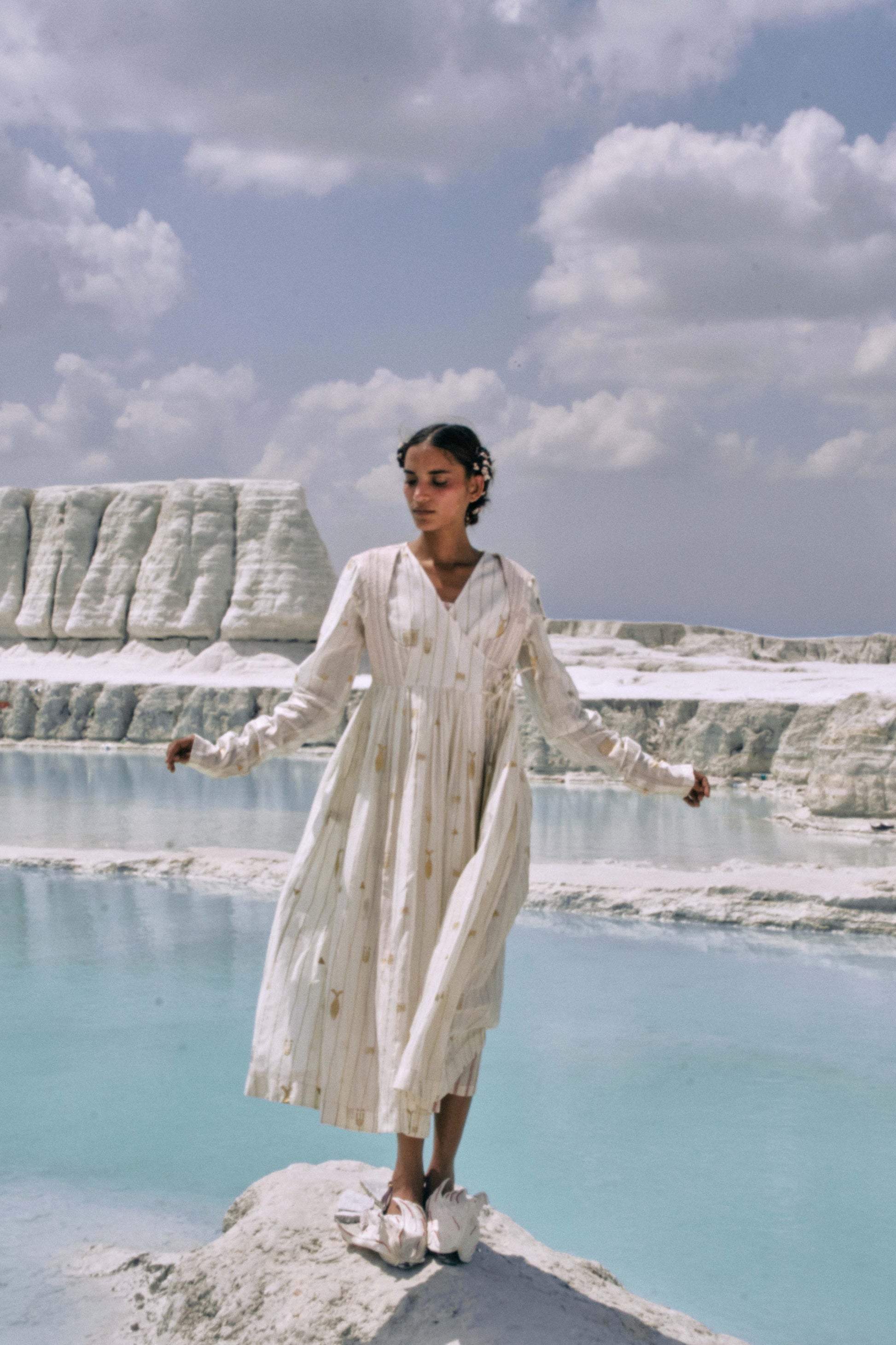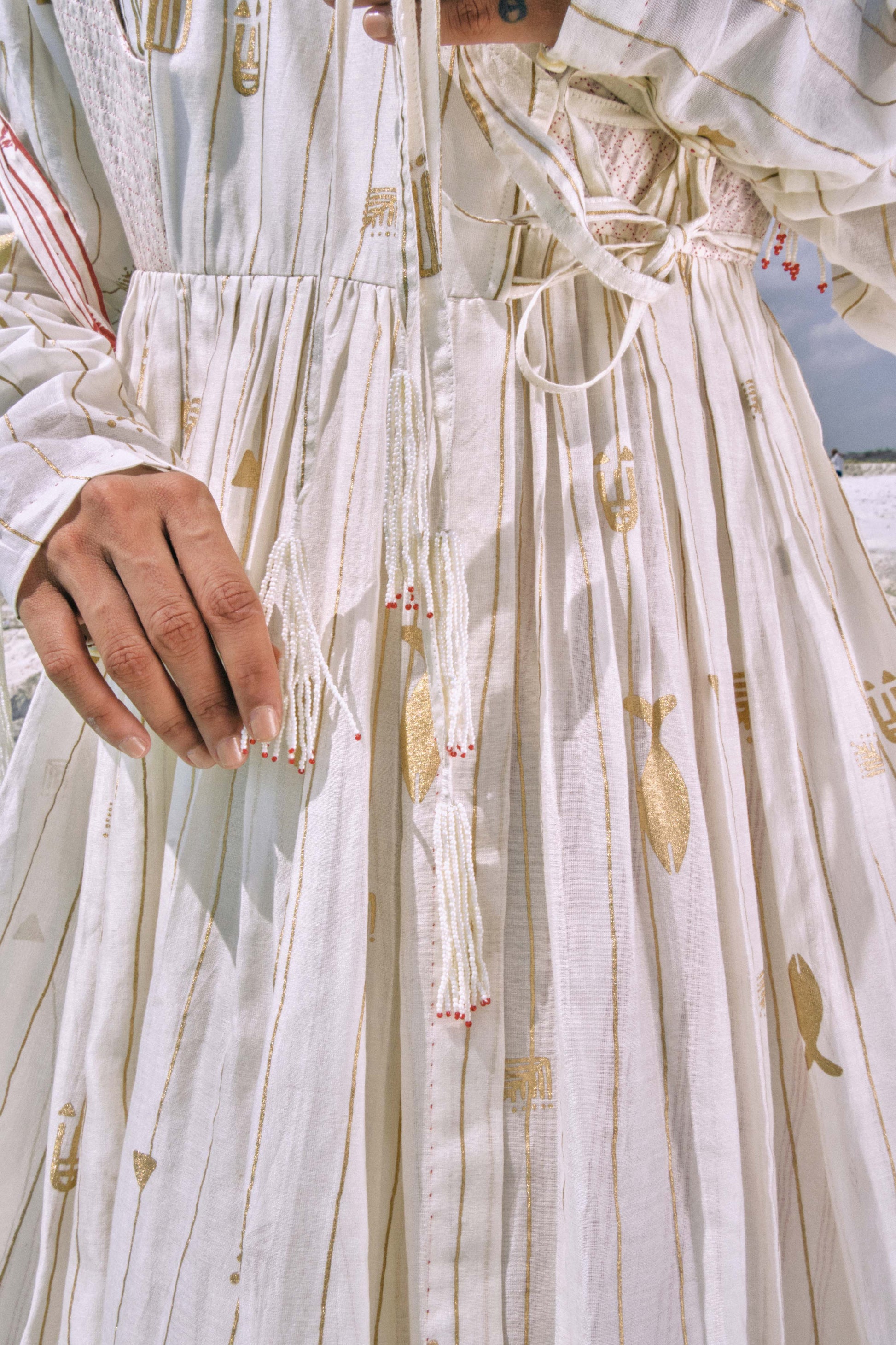 The Elysia Angrakha, in hand-screen-printed cotton silk, is a graceful complement to any bottom. A quilted yoke and overlapping panels are secured with tie-ups finished with handmade beaded tassels, while traditional gathered sleeves with button-loop cuffs add subtle charm. Paired with a cotton slip, it drapes effortlessly, celebrating the ease of balmy days and quiet elegance. Each stitch and tassel has been carefully executed with hours of meticulous artisan labour, rendering the top a wearable work of refined craftsmanship.