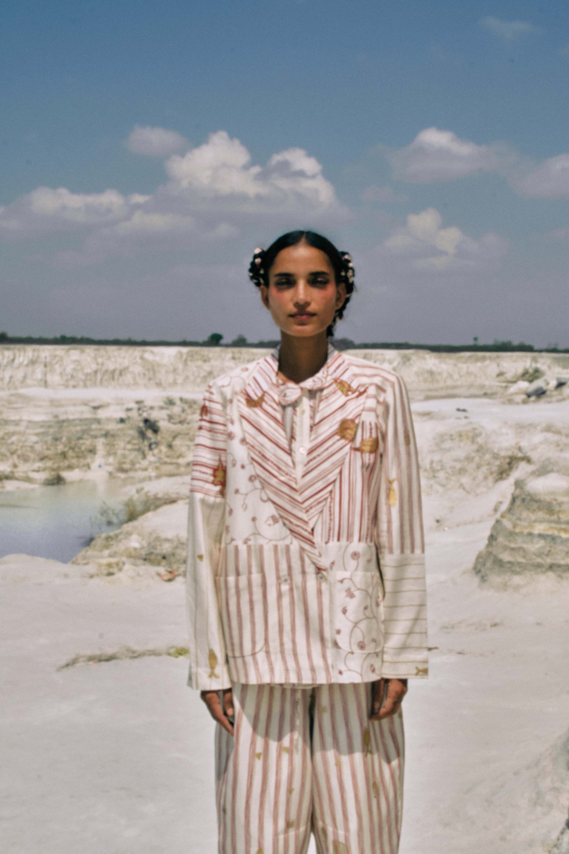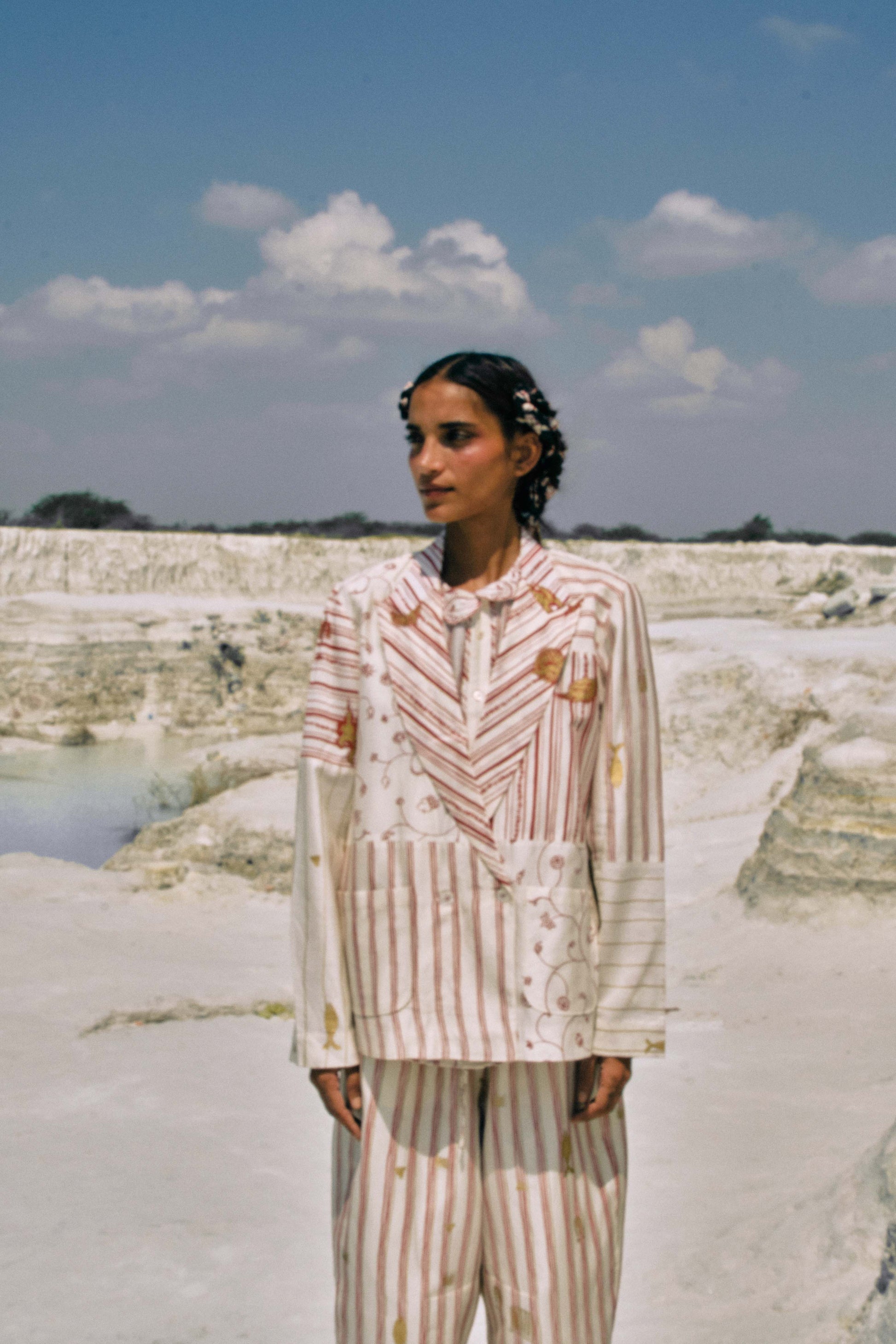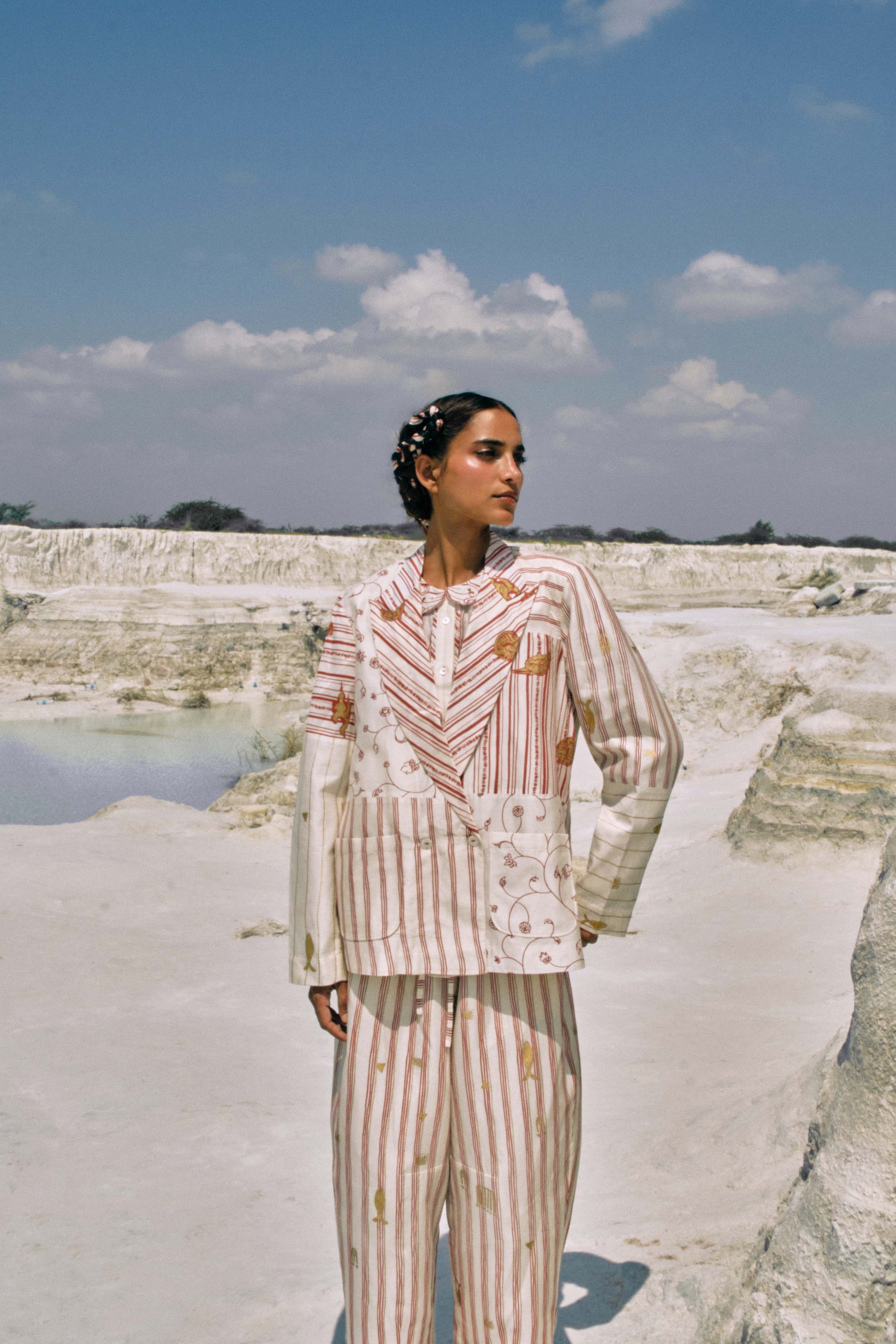 A true statement of craftsmanship, the Lumina Double-Breasted Blazer is a canvas of the collection’s fabrics and prints. Each patch has been meticulously placed and stitched over hours of labour, reflecting the dedication and artistry of the artisans. Featuring a classic pointed lapel, structured silhouette, and functional pockets, this blazer embodies refinement, artistry, and the careful integration of multiple textures and motifs into a single harmonious piece.