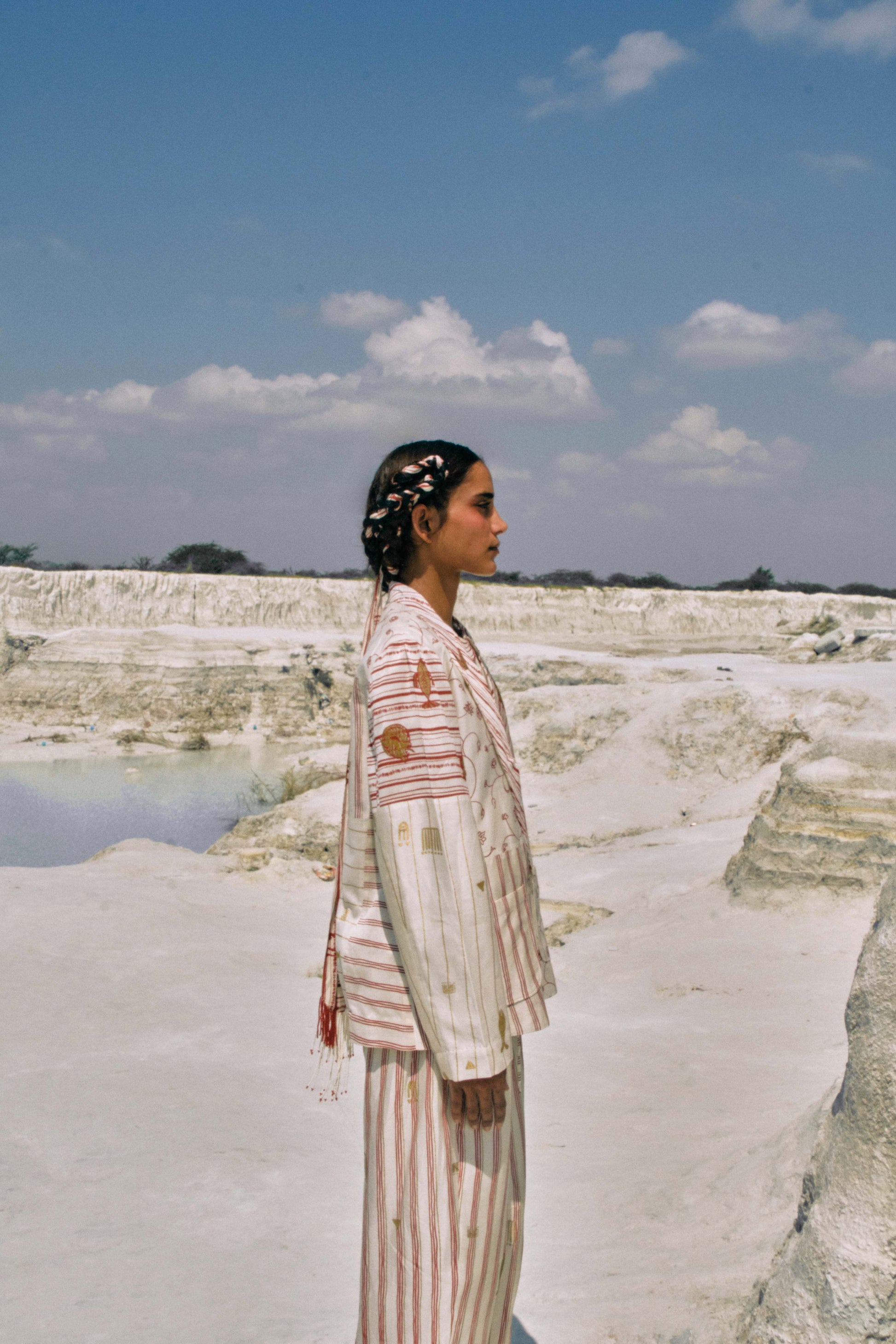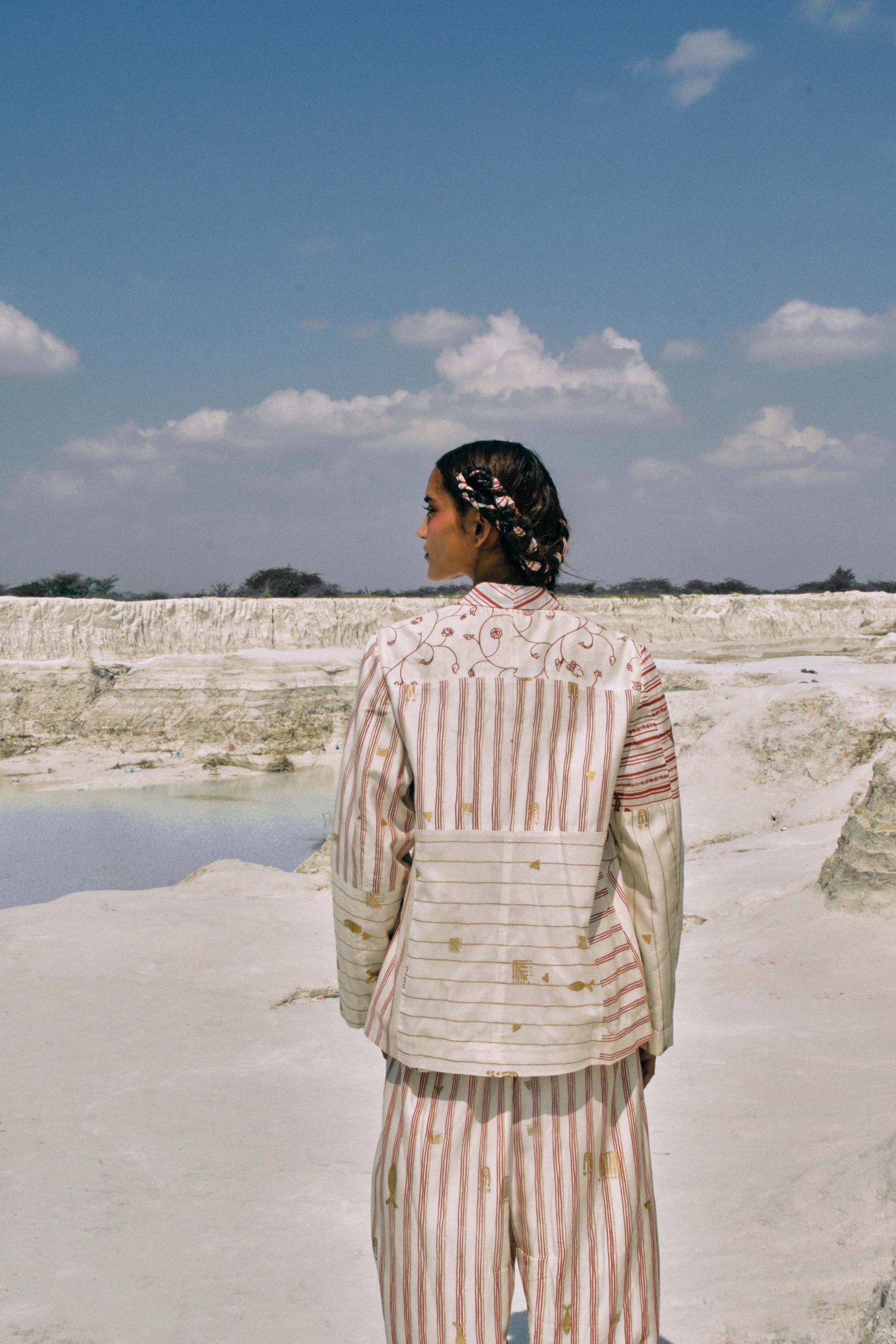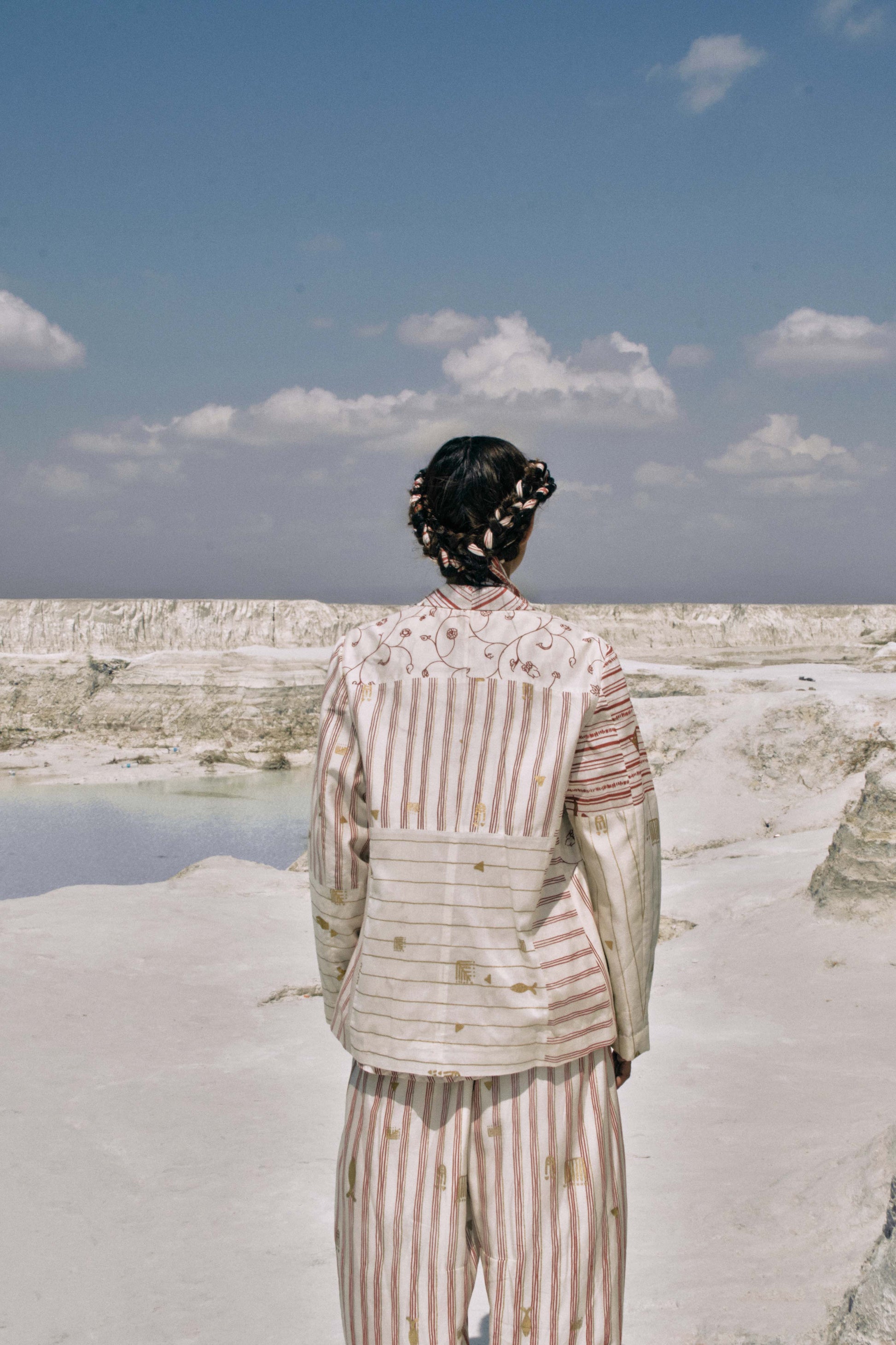 A true statement of craftsmanship, the Lumina Double-Breasted Blazer is a canvas of the collection’s fabrics and prints. Each patch has been meticulously placed and stitched over hours of labour, reflecting the dedication and artistry of the artisans. Featuring a classic pointed lapel, structured silhouette, and functional pockets, this blazer embodies refinement, artistry, and the careful integration of multiple textures and motifs into a single harmonious piece.