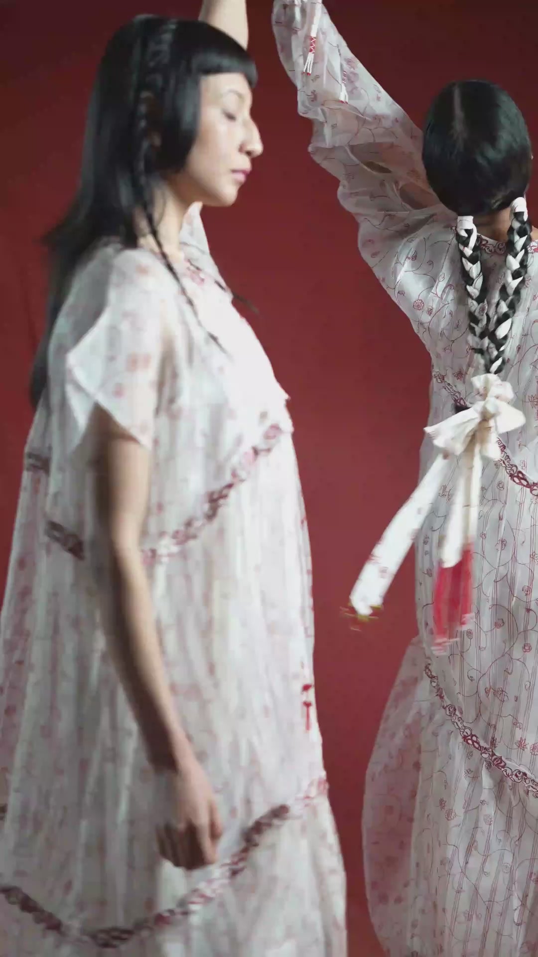 The Ei Mon Organza Tier Dress is a three-tiered masterpiece of hand-screen-printed organza. Delicate gathers and intricate embroidered lace detailing run throughout, while front tie-ups finished with handmade beaded tassels ensure a customizable fit. The layered tiers cascade gracefully, creating an airy, ethereal drape over the body. Each stitch, tassel, and embroidered detail reflects hours of meticulous craftsmanship, making this dress a celebration of femininity, comfort, and refined artistry.