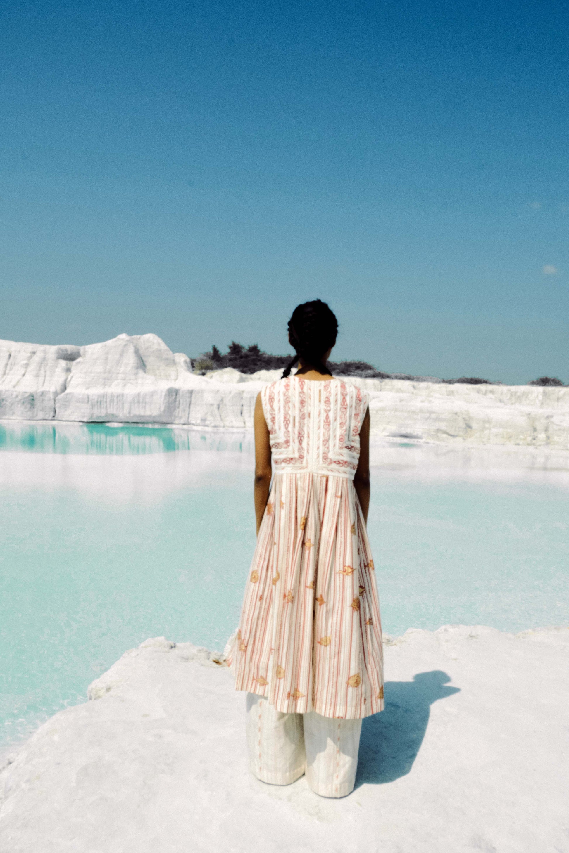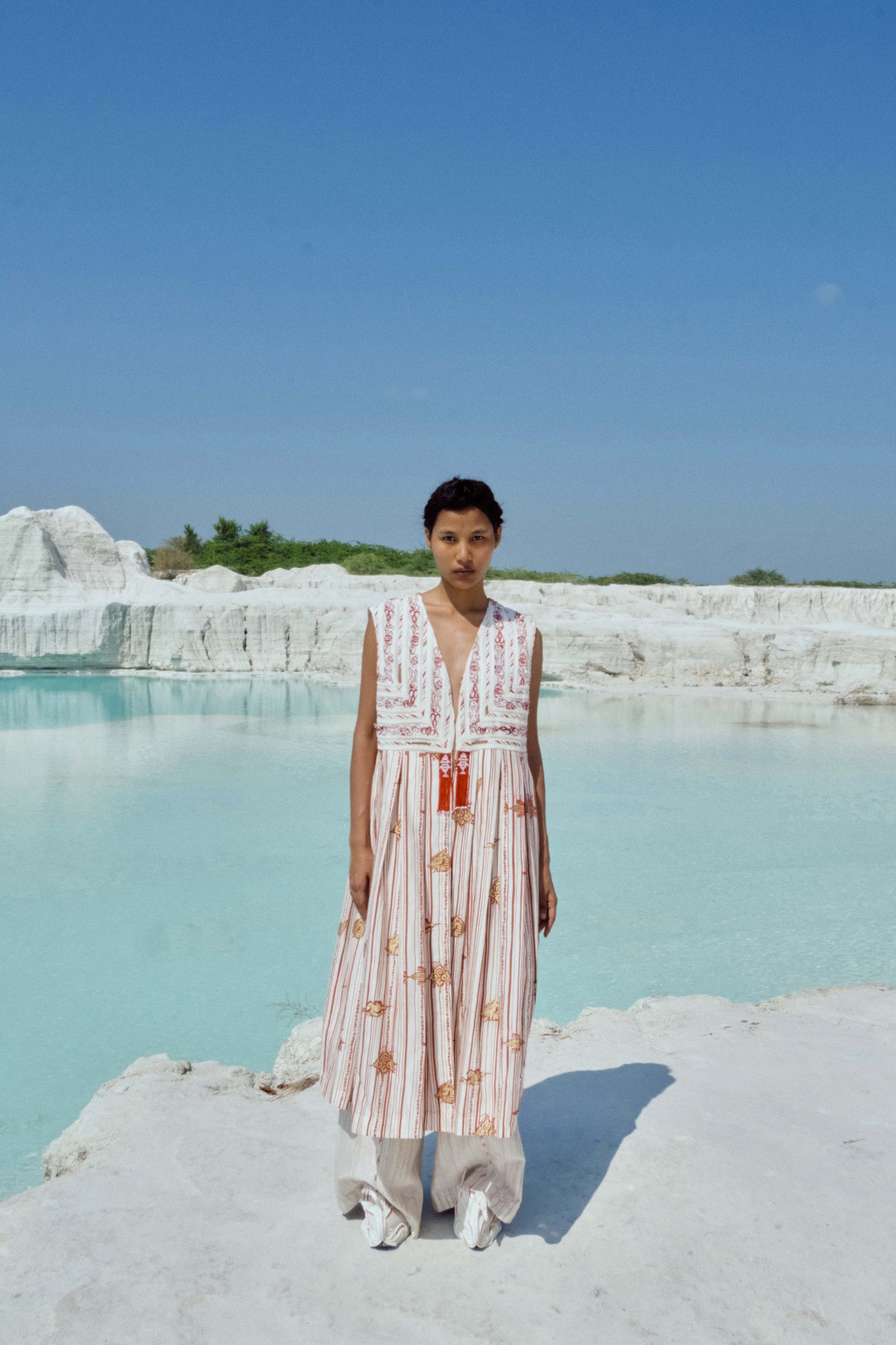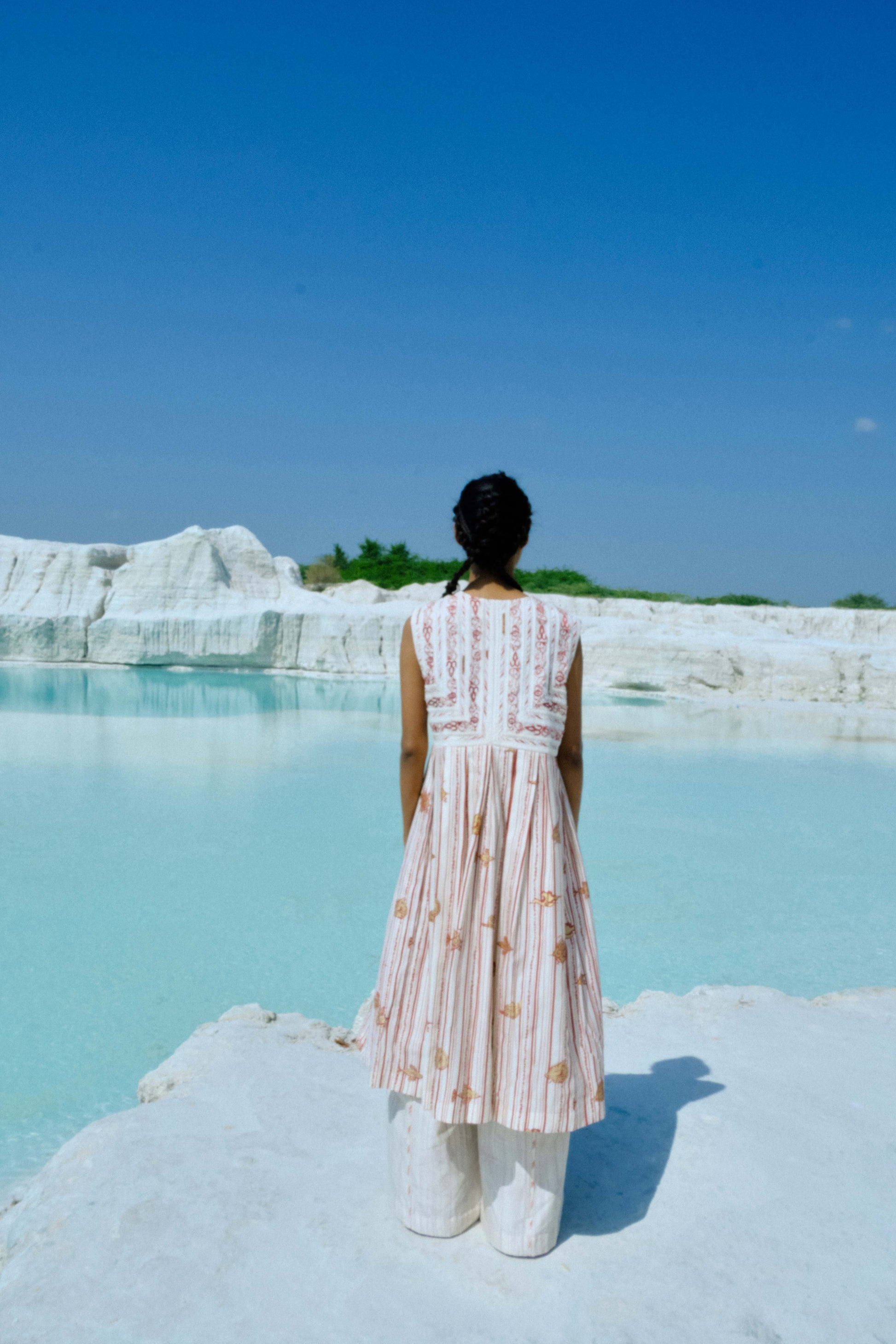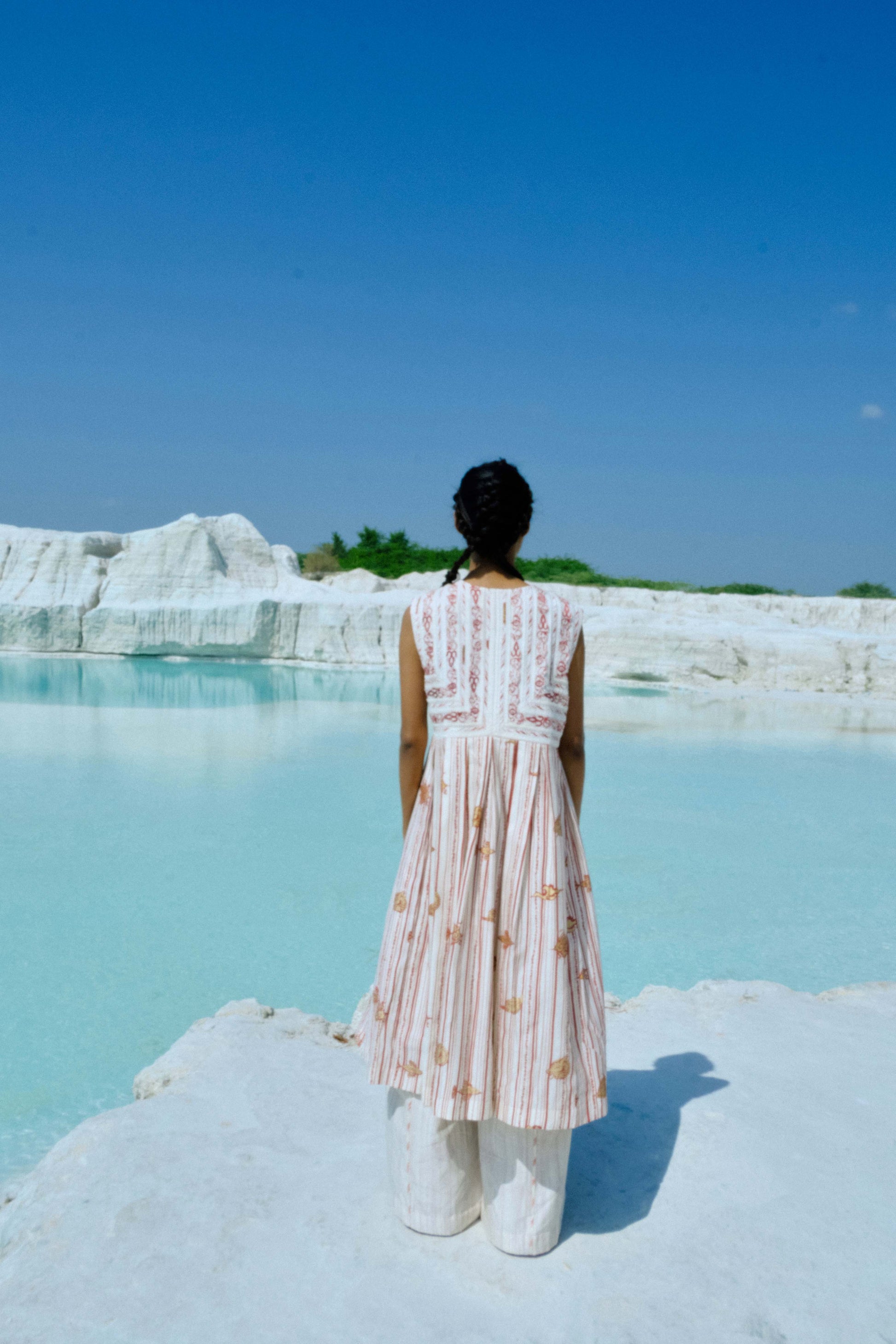Crafted in hand-screen-printed cotton silk, the Kalaia Lace Jacket celebrates a union of print and lace in perfect harmony. Each geometric line of the bias binding and floral curve of the embroidered lace has been carefully aligned, reflecting hours of precise, skilled labour. The silhouette flows freely, offering ease while maintaining a classic, refined shape. Loose yet thoughtfully tailored, this jacket embodies effortless elegance, versatile for formal occasions or graceful everyday wear, and stands as a testament to artisanal dedication and meticulous design.