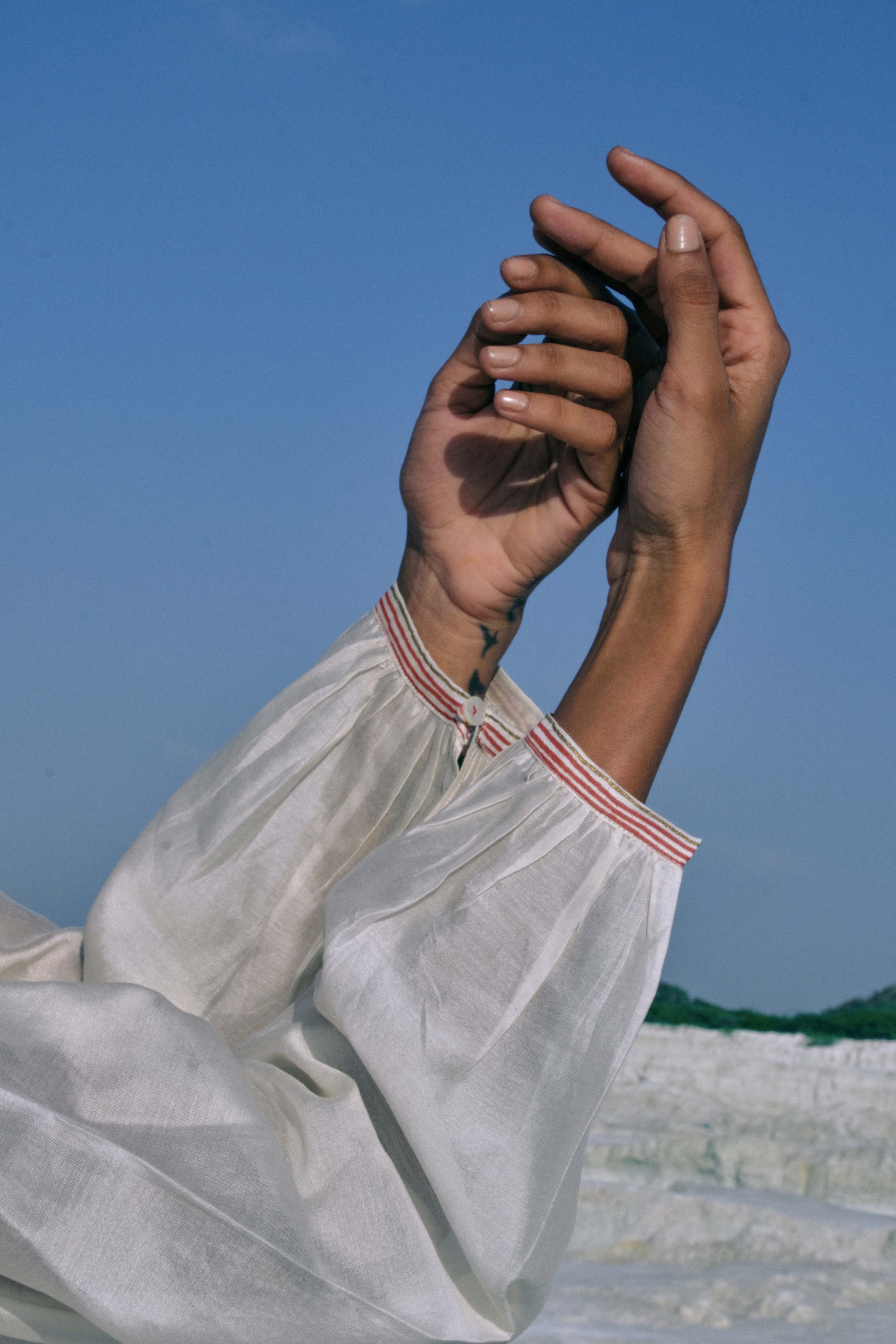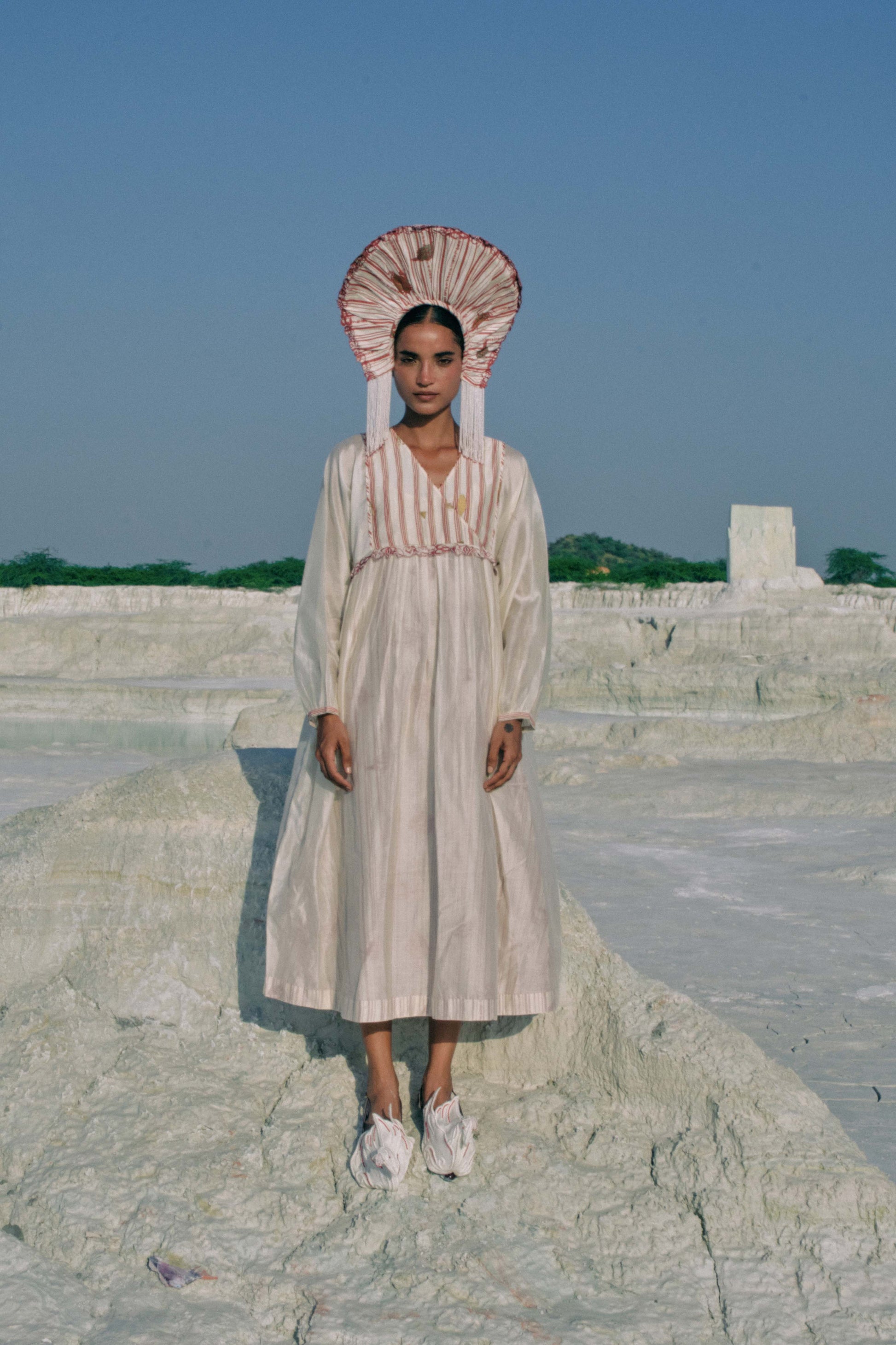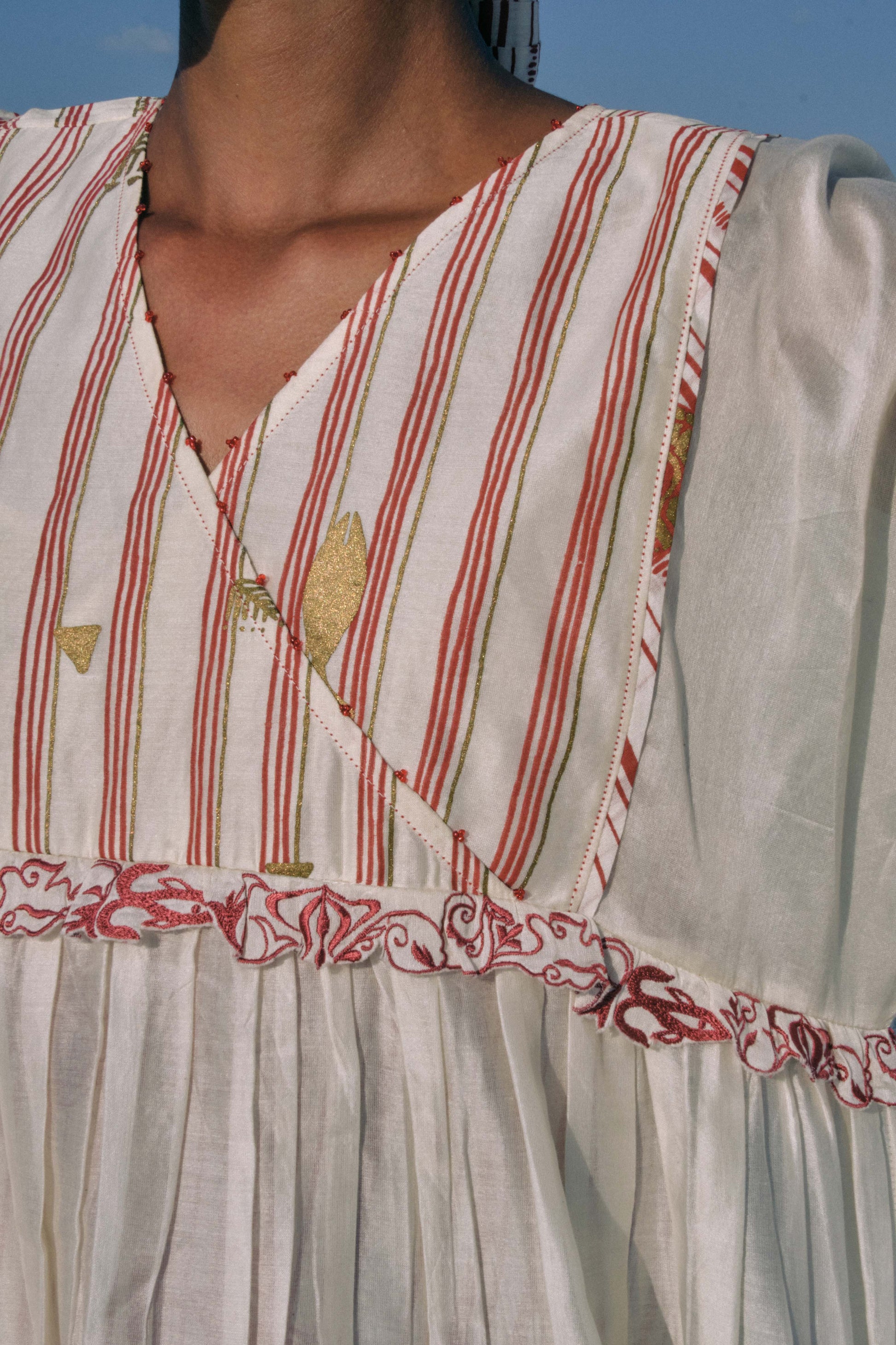 Crafted in plain cotton silk, the Su Mon Square Sleeve Dress exudes timeless elegance. Its overlapping hand-screen-printed yoke features hand-stitched beads and embroidered lace, while gathered sleeves finish with button-loop cuffs for subtle refinement. Paired with a printed slip, the dress offers glimpses of print beneath, adding depth and intrigue. Every bead, stitch, and pleat has been carefully executed over hours of dedicated labour, creating a dress that embodies graceful sophistication and artisanal mastery.