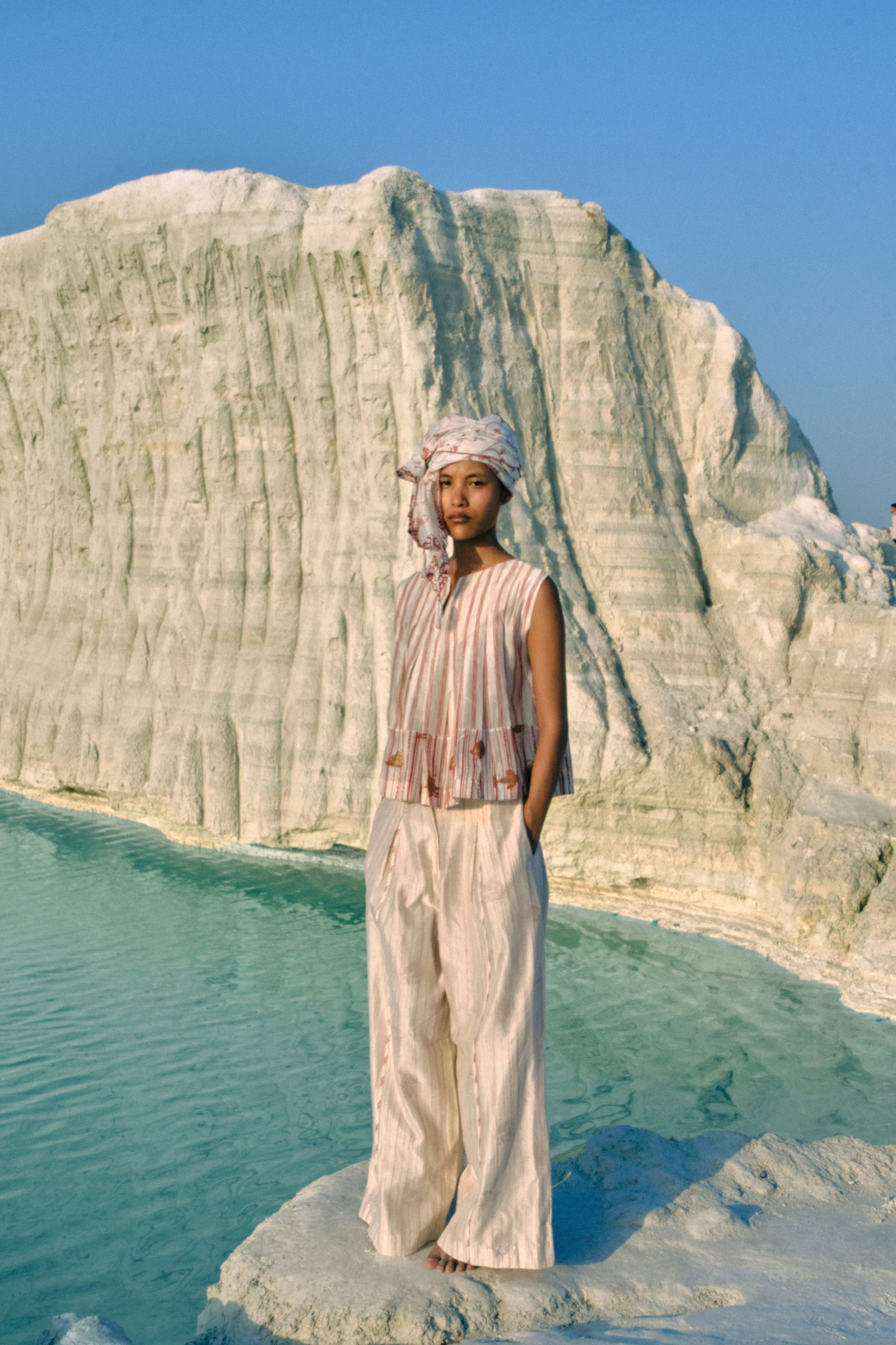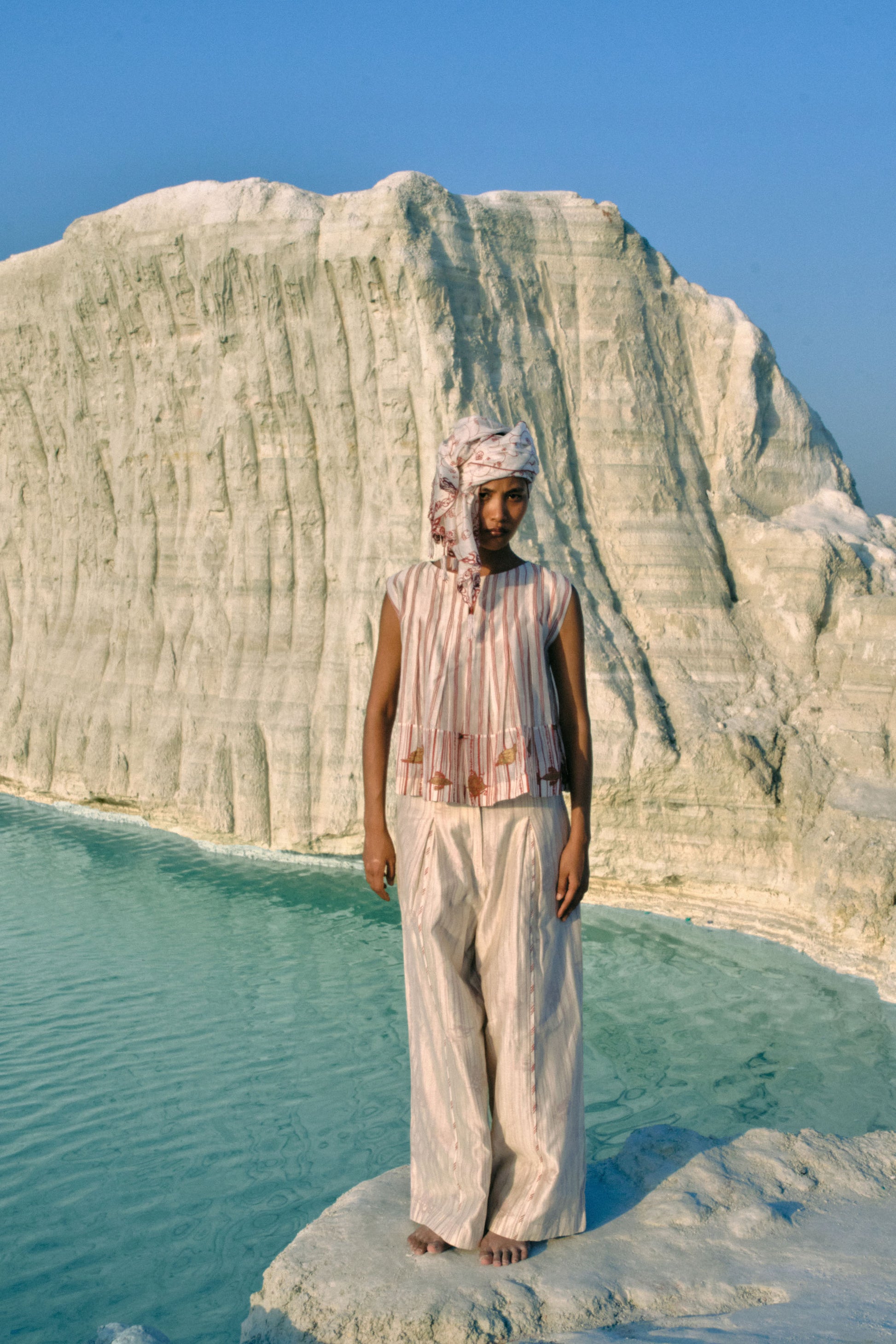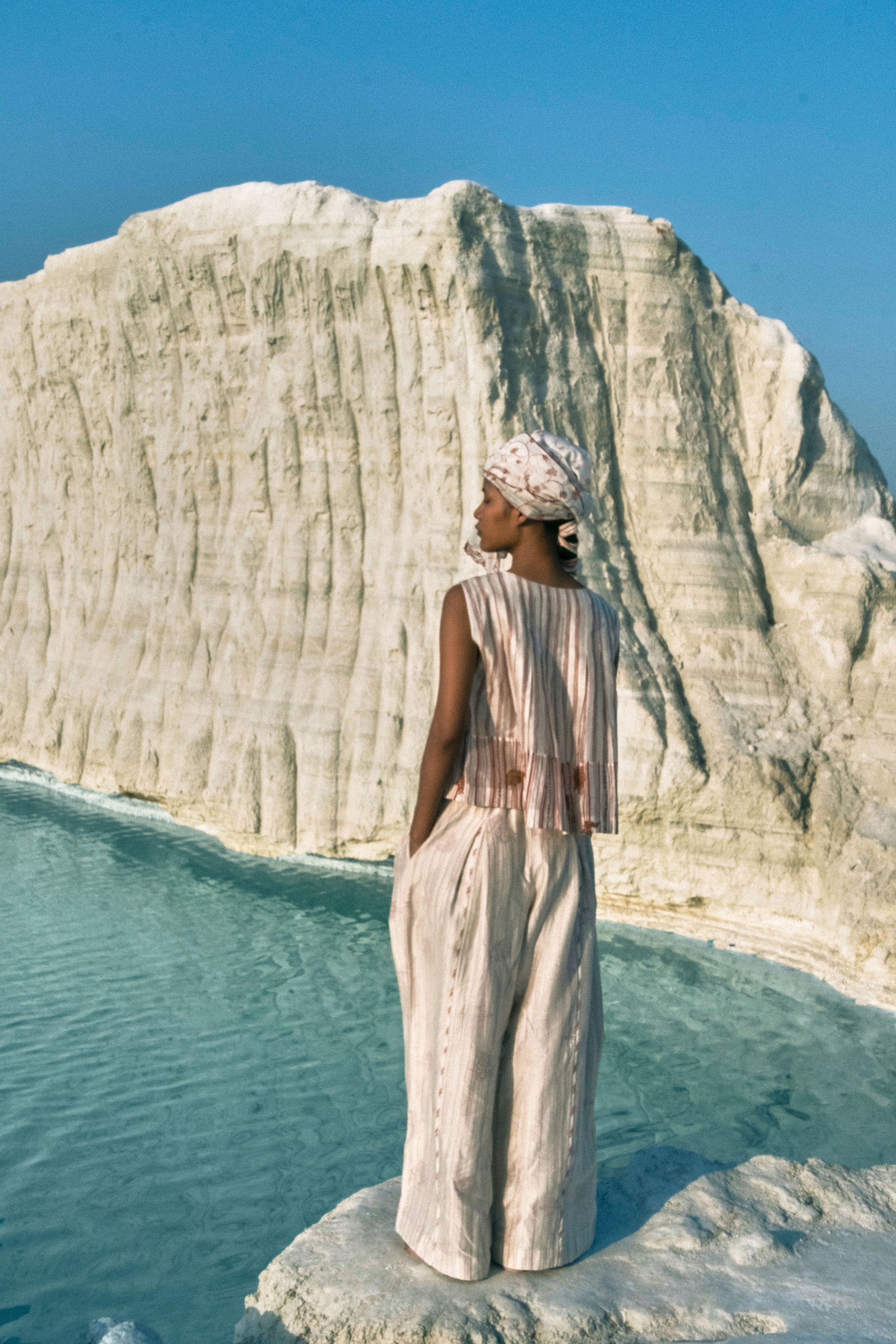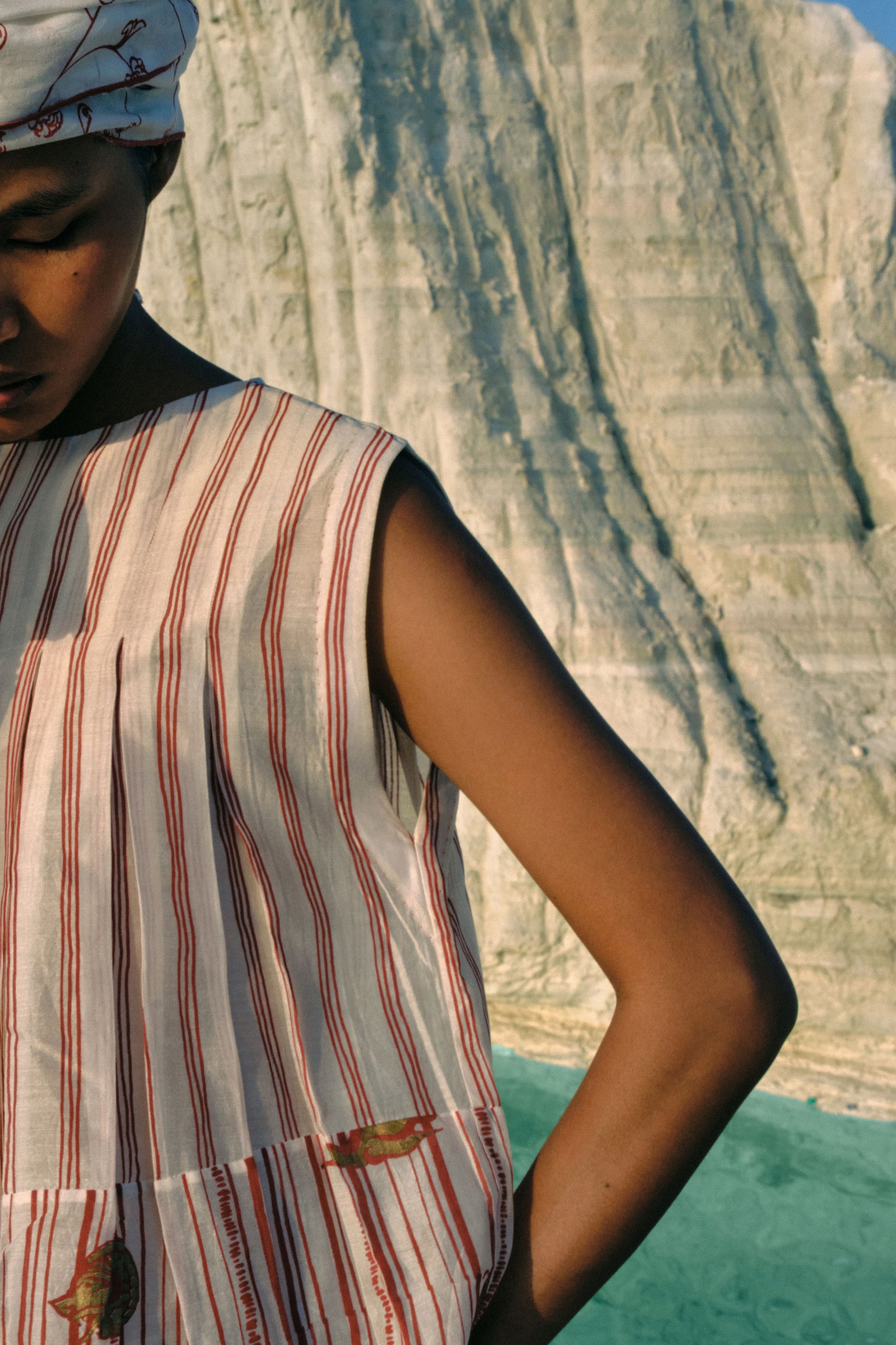 The May Box Pleat Top redefines a classic silhouette with hand-screen-printed cotton silk, sculpted box pleats, and an open neckline. A keyhole-like armhole detail and relaxed fit balance contemporary charm with subtle sophistication. Every pleat, stitch, and finishing detail reflects hours of meticulous handwork, creating a piece that is both versatile and a testament to refined craftsmanship.